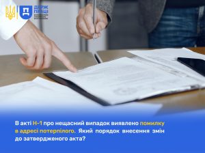 02 Березня 2026В акті про розслідування нещасного випадку на виробництві (акт за формою Н-1), отриманому потерпілим для звернення за належними страховими виплатами, виявлено помилку в адресі місця проживання та реєстрації потерпілого. Який механізм існує для приведення у відповідність відомостей, викладених в затверджених актах розслідування?